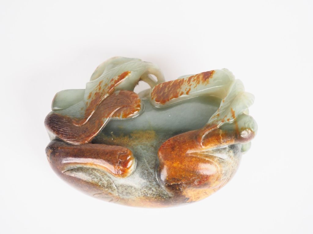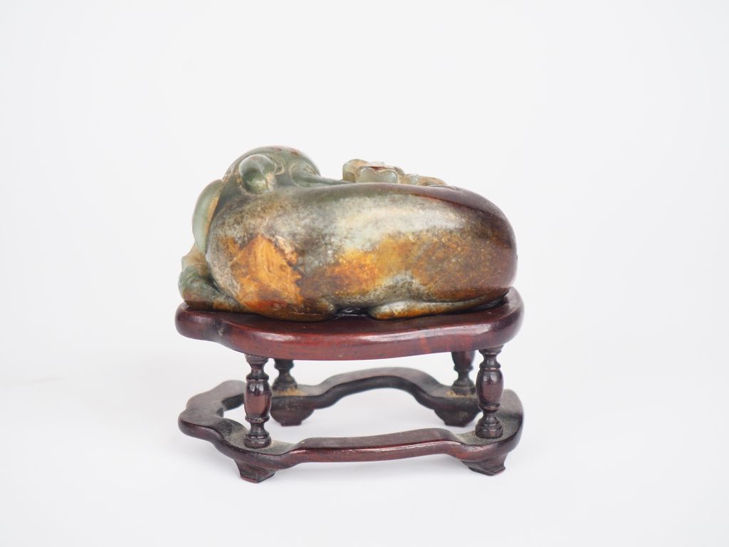 Chine, XVII-XVIIIe siècle, Groupe en jade céladon veiné de rouille représentant un qilin au repos tenant une branche de lotus épanoui dans sa gueule L. 8 cm