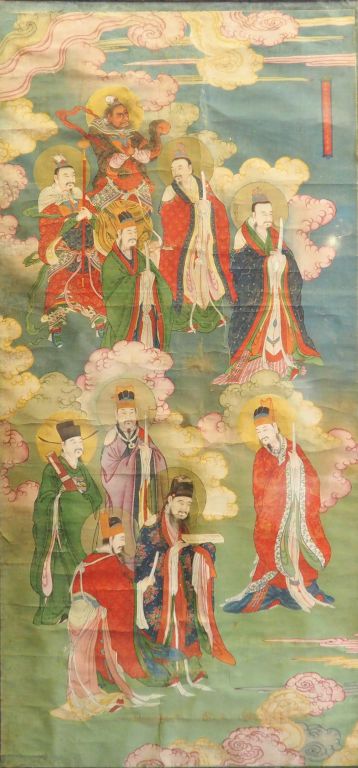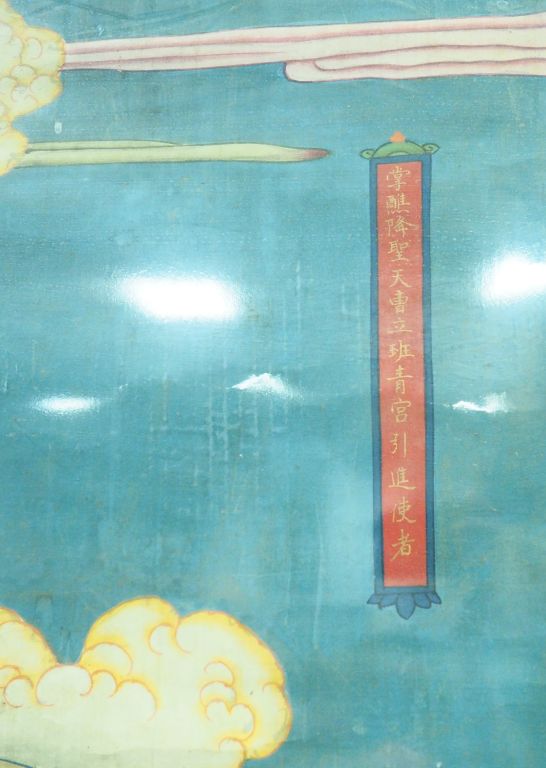 Chine, XVIIe siècle Importante peinture à l’encre et couleurs sur soie représentant un panthéon taoïste se livrant à une cérémonie dans des cieux parmi des nuages tourbillonnants. Cartouche en haut à droite. Usures, craquelures et petites déchirures.