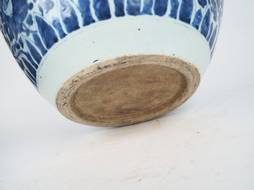 Chine, XVIIe siècle, Vasque à poissons en porcelaine à décor en bleu sous couverte de lotus et rinceaux feuillagés. Fêle H. 32 cm D. 39 cm
