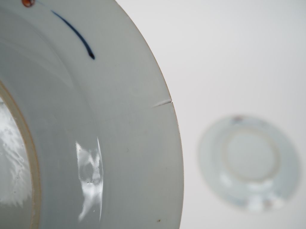 Chine XVIIIe siècle, Deux assiettes en porcelaine à décor dit "imari chinois" de scènes paysagées. Eclats et egrenures. Diam. 22 cm