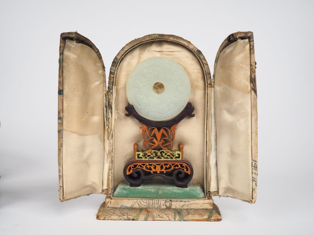 Chine, XVIIIe siècle, Disque Bi en jade blanc finement sculpté d'un qilong tenant une branche de deux lingzhi. Le revers finement sculpté d'un entrelac de quatre qilong reposant sur un socle en bois sculpté et ajouré. Dans son coffret en tissu brodé de saule pleureur, lotus et deux divinités. Infime egrenure Usures du coffret D, 5,6 cm H. 11,5 cm