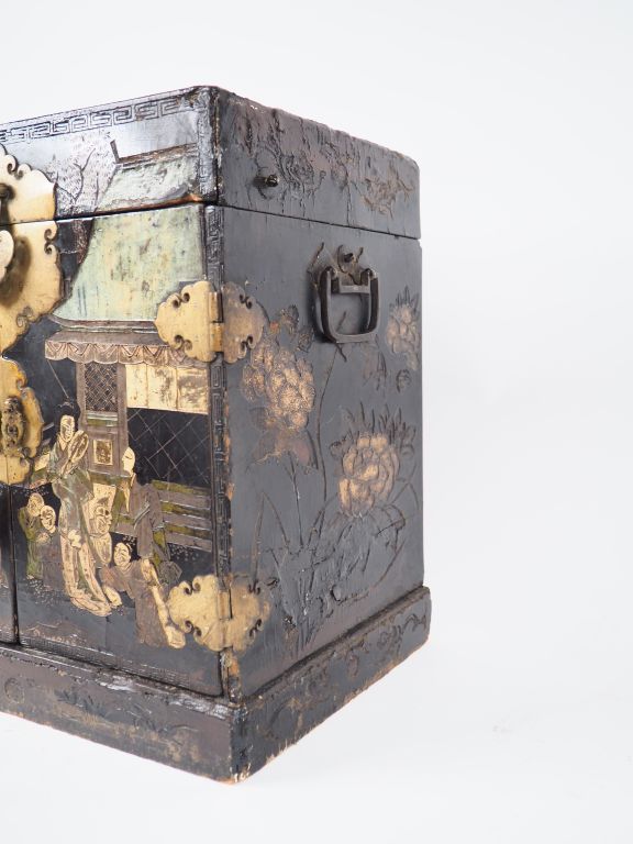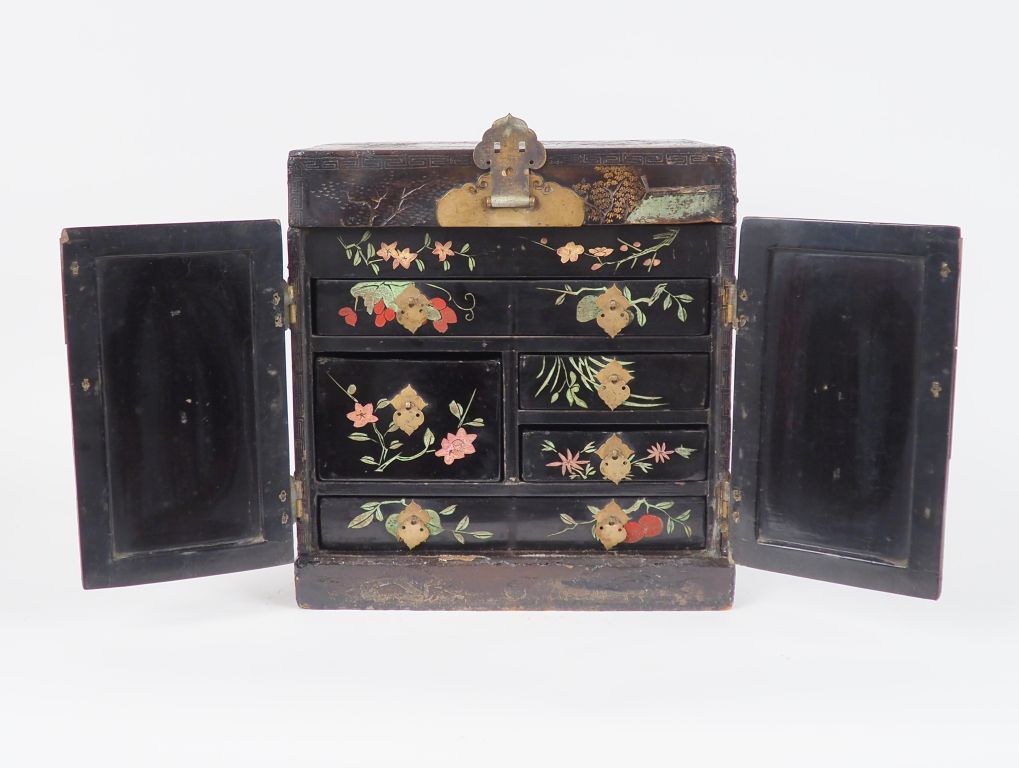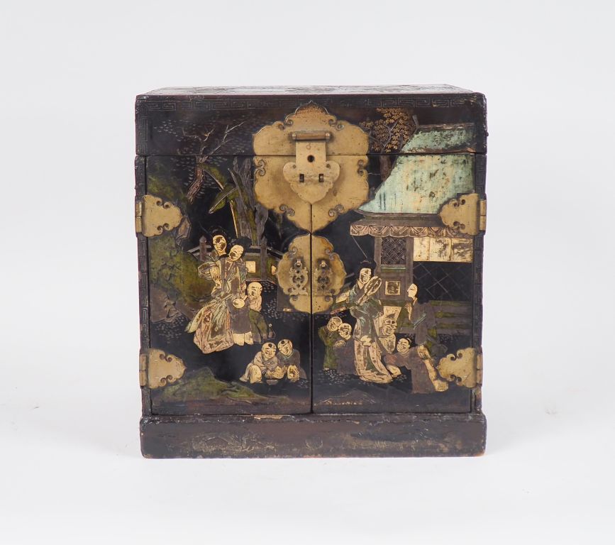 Chine, XVIIIe siècle Guanpixian en laque de Coromandel ouvrant à deux portes et abattants ouvrant sur cinq tiroirs à décor de personnages H. 32 cm
