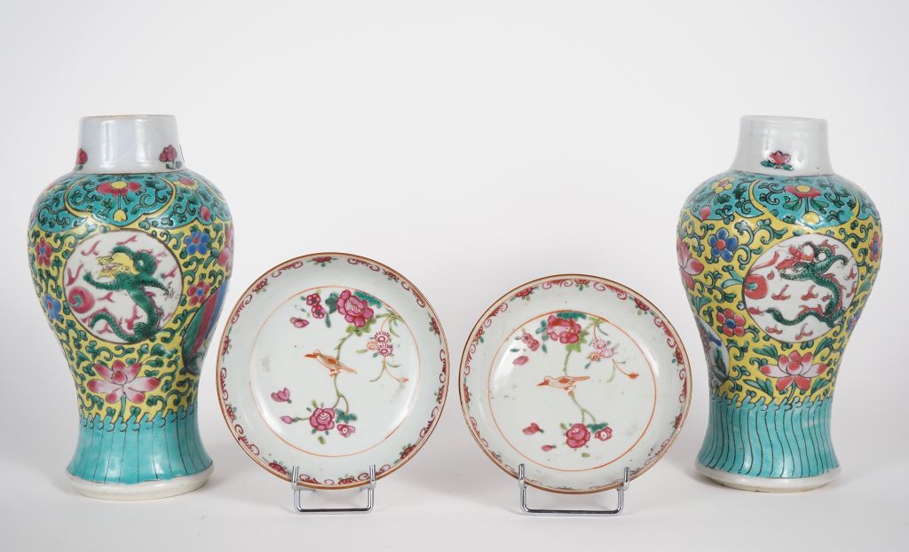Chine, XVIIIe siècle Lot comprenant une paire de potiches en porcelaine et émaux de la famille rose, à décor en médaillons de dragons, fleurs, rinceaux , une paire de coupes en porcelaine et émaux de la famille rose sur fond capuçin, à décor d’oiseaux et fleurs. H. 22,5 cm – Diam. 13 cm (Cols restaurés aux vases – petit éclat à une coupe, fel)