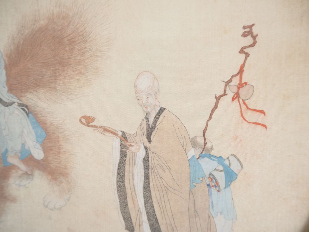 Chine, XVIIIe siècle Peinture en médaillon circulaire, encre et couleurs sur soie, représentant un dignitaire présentant un sceptre ruyi à l’un des 18 lohans chevauchant un lion bouddhique. Diam. 24 cm