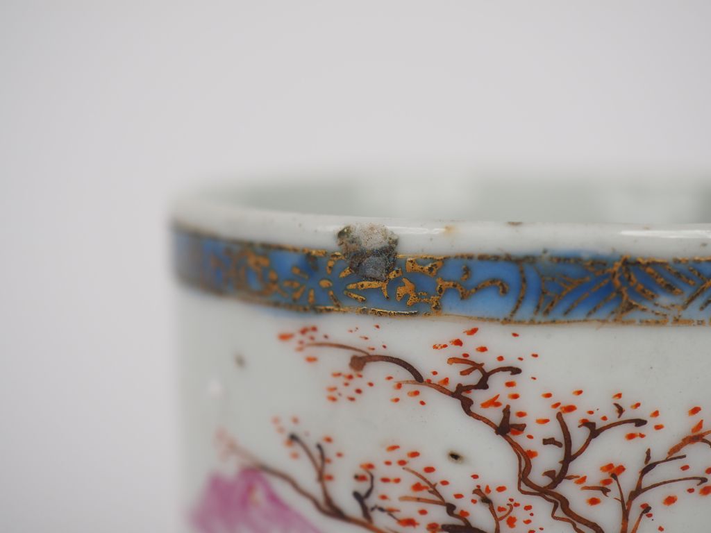 Chine, XVIIIe siècle, Tasse en porcelaine et émaux de la famille rose, décor d'une cité portuaire. H. 6 cm. (légère égrenure sur la bordure)