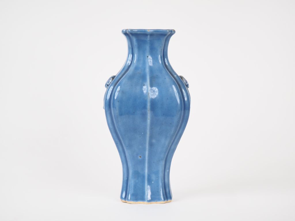 Chine, XVIIIe siècle, Vase quadrangulaire à panse godronnée en porcelaine émaillée bleu lavande orné de deux anses représentant des papillons et des anneaux. H. 22,5 cm (quelques sauts d'émail, un fel de cuisson).
