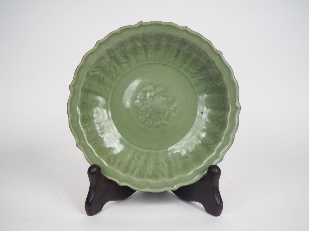 Chine XXe, dans le style des Ming Plat céladon floriforme en porcelaine émaillée céladon Diam 35 cm