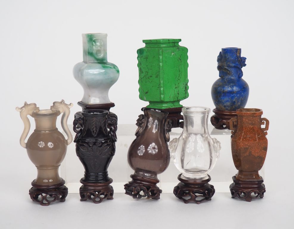 Chine Xxe siècle, Coffret Comprenant huit vases de maîtrise en pierres dures (cristal de roche, jadéite, lapis lazuli...)