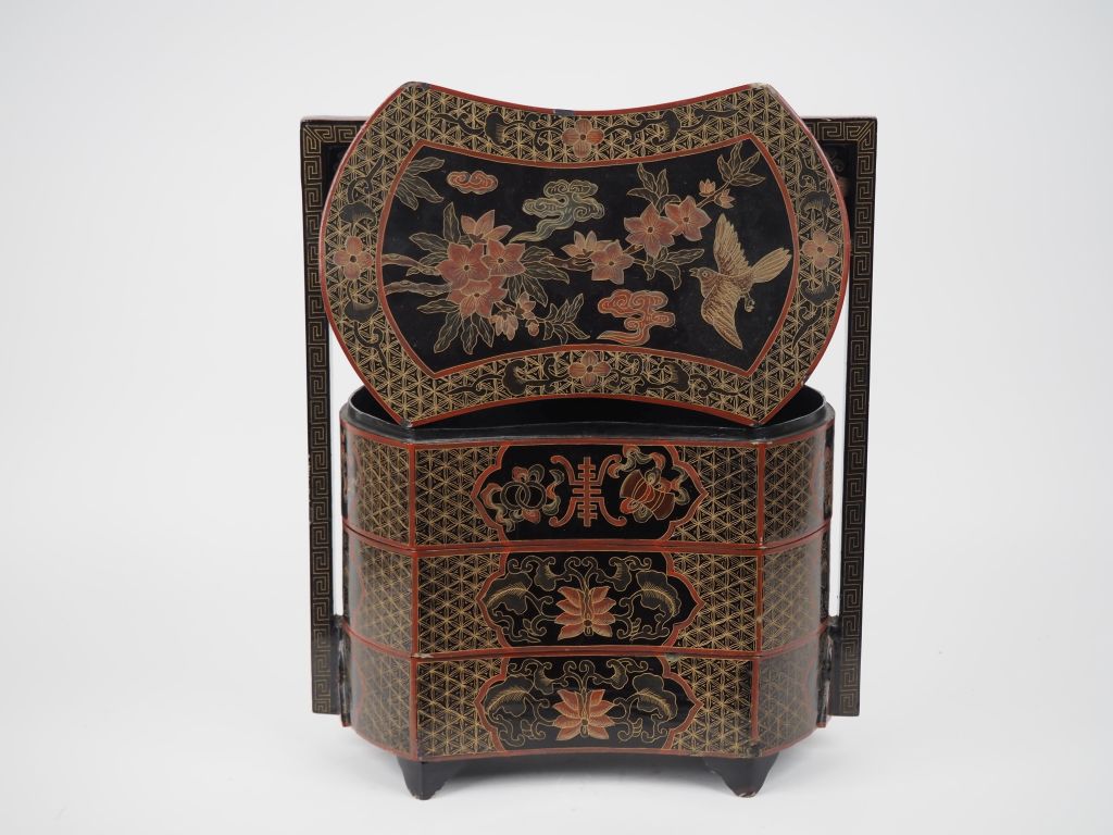 Chine, XXe siècle, Coffret de voyage en laque rouge et noire à trois compartiments à décor en médaillons de calligraphies, lotus et emblèmes bouddhiques sur fond de motifs géométriques. L’anse ornée de motifs de frises de grecques. Dim. 15 x 33 x 29 cm (accidents)
