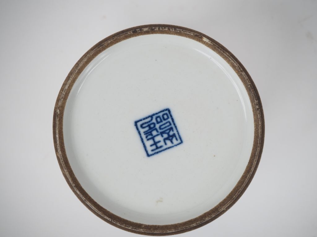 Chine Xxe siècle, Deux objets de lettrés en porcelaine bleu blanc comprenant un porte pinceaux à décor de lettrés à l'intérieur d'un pavillon entouré de nuages et de bananiers et un godet de peintre à décor imprimé d'une jeune femme jouant du qi. Marque au pochoir au revers. H. 14,5 cm et H. 9 cm