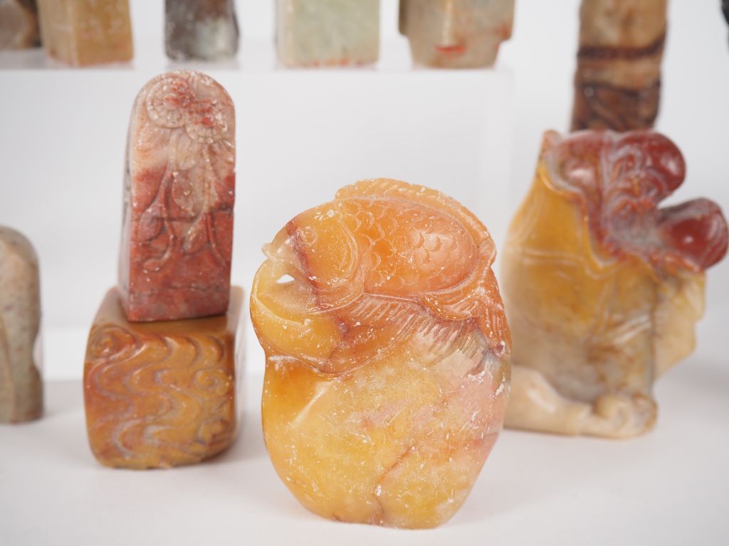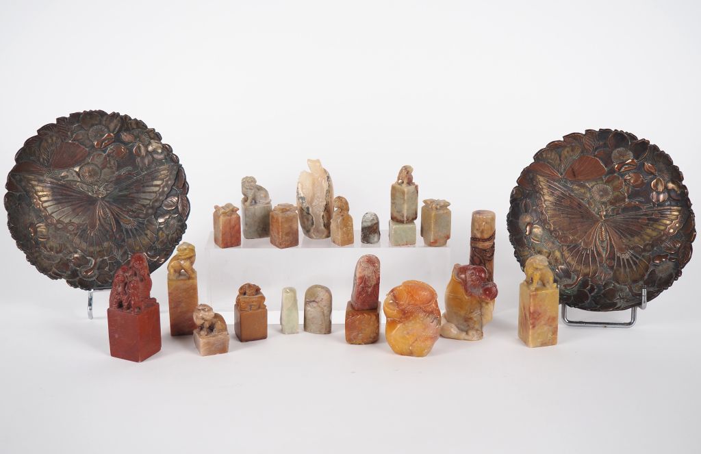Chine, XXe siècle Ensemble comprenant 21 cachets en stéatite, à décor de personnages, prises zoomorphes. Travail du Fujian. (un cachet accidenté) H. 2,5 à 7,5 cm On y joint deux coupes en plomb à décor ciselé de papillons. Diam. 13 cm