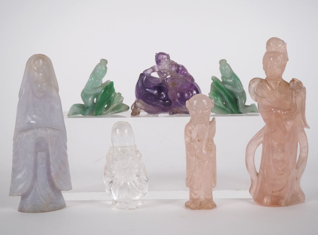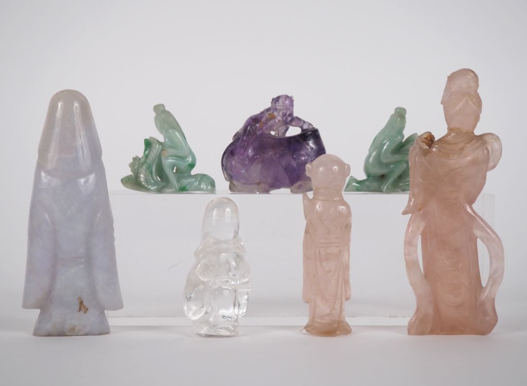 Chine, XXe siècle, Ensemble comprenant sept pierres dures dont agate, jade, quartz, améthyste et cristal de roche représentant shoulao, déesses du printemps, lion bouddhique… Accident à la tête d’une divinité en quartz. H. 4 à 11 cm