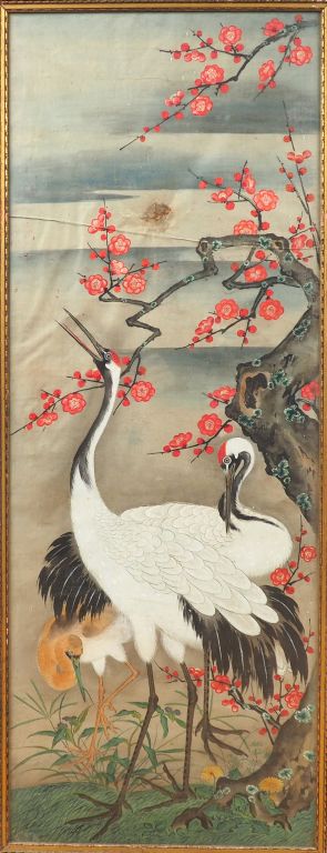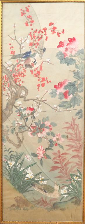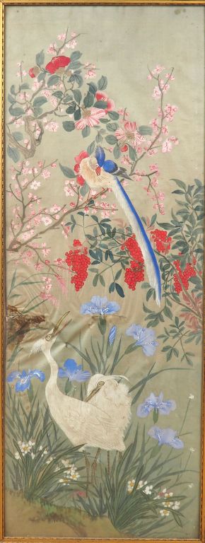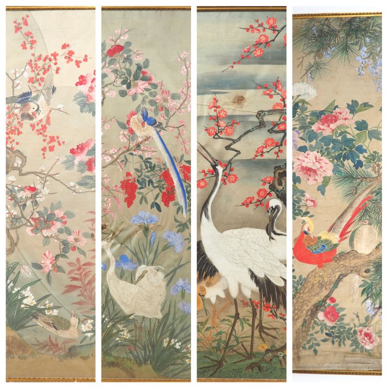 Chine, XXe siècle, Ensemble de quatre tentures sur soie à décor de fleurs, oiseaux et échassiers. Dim. 120 x 44,5 cm