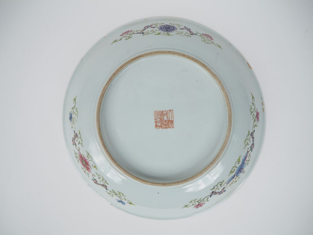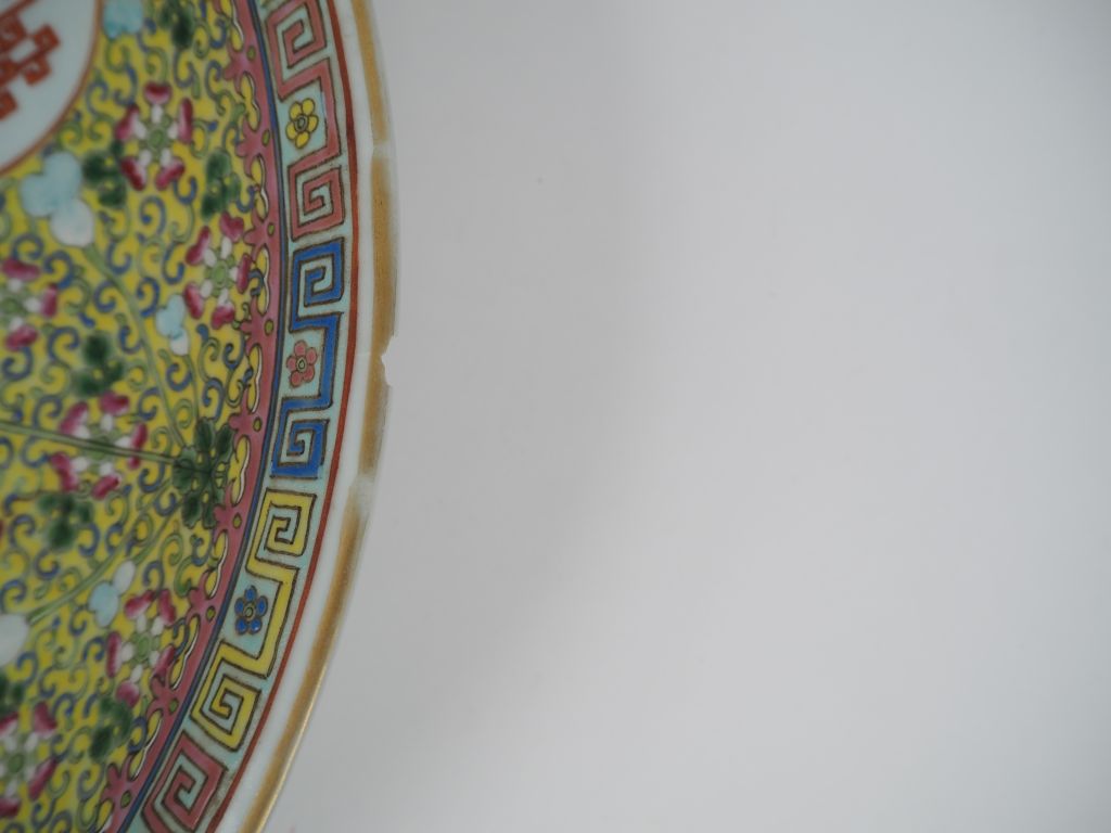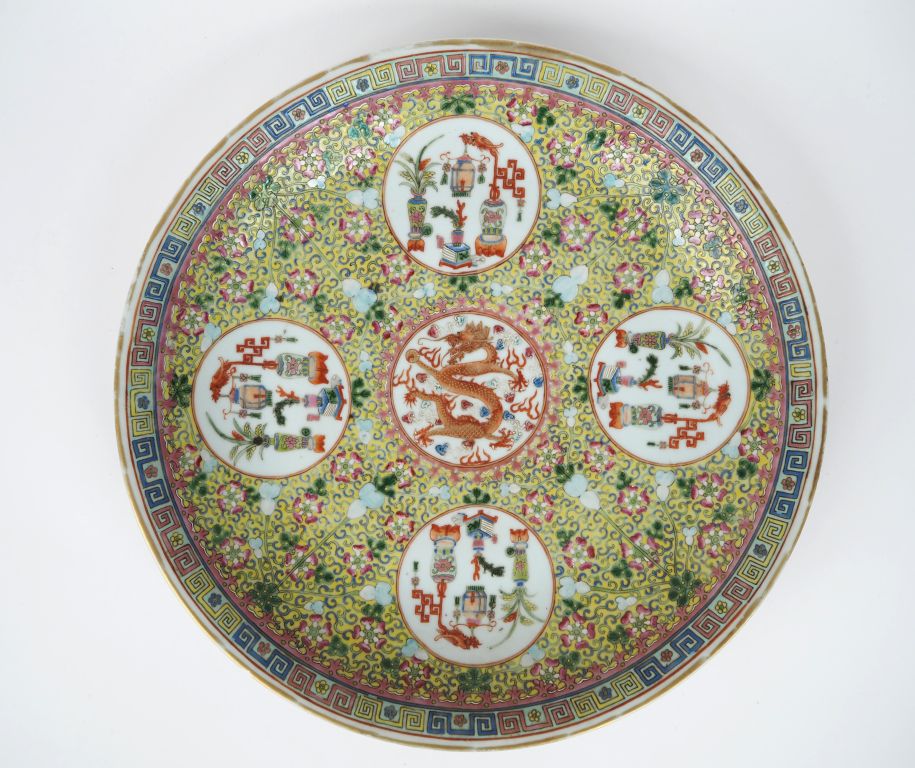 Chine Xxe siècle, Important plat en porcelaine et émaux polychromes, à décor en cinq médaillons d'un dragon et objets mobiliers reposant sur un fond jaune orné de fleurs. Marque apocryphe Qianlong sur la base. Eclat. Diam. 37 cm