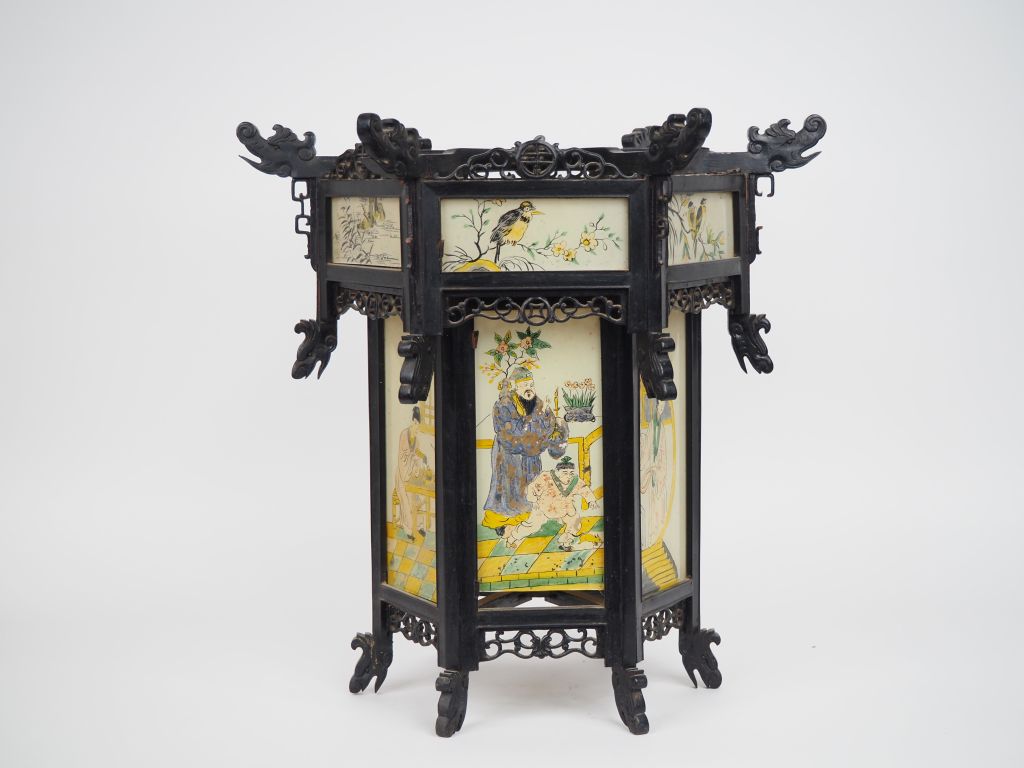Chine XXe siècle, Lanterne de forme hexagonale, en bois noirci, à décor en verre peint de personnages, oiseaux, fleurs et végétaux. H. 49 cm (petits manques)