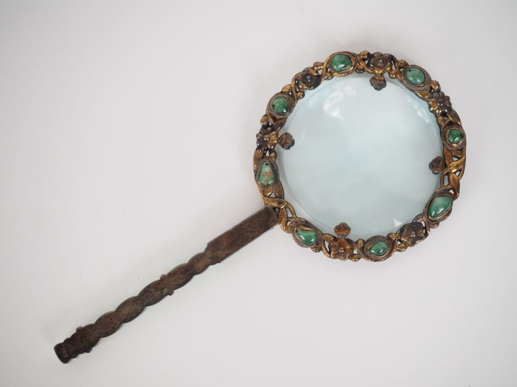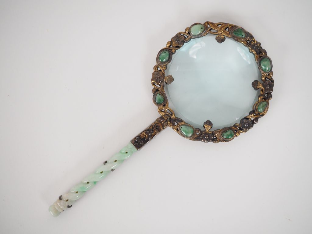 Chine, XXe siècle, Loupe montée sur argent, le manche tressé en jadéite. Le pourtour de la loupe orné de cabochons de jadéite et fleurs. Dim. 14,5 x 7 cm