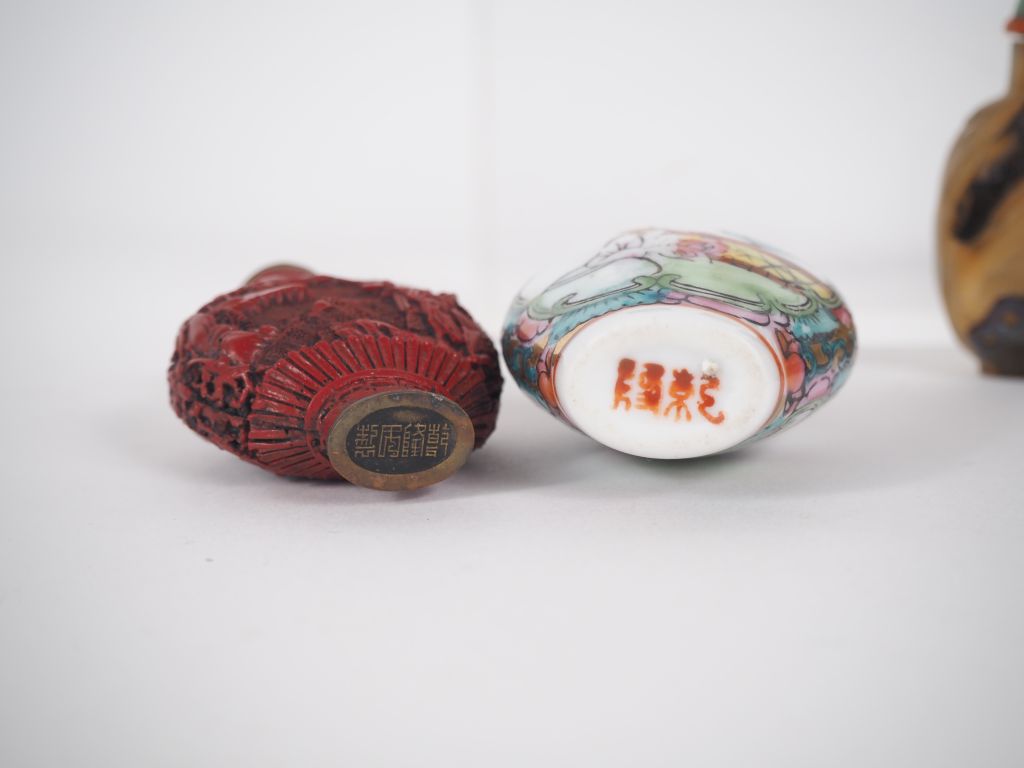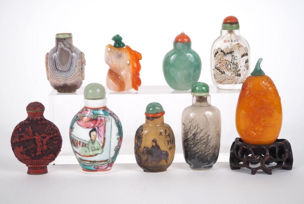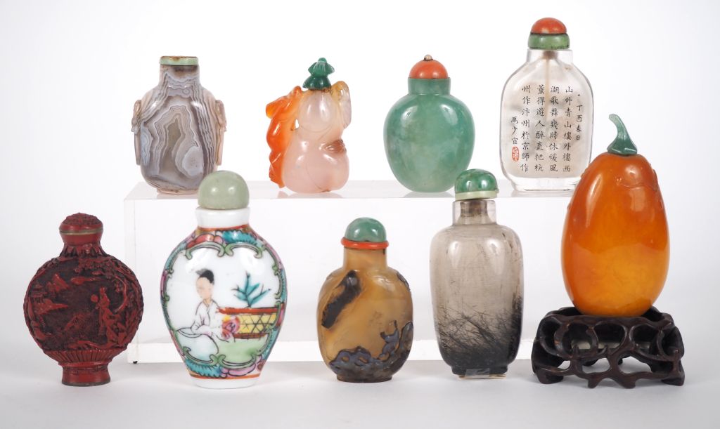 Chine, XXe siècle, Neuf flacons tabatières en pierre dures dont une en jadéite, copal orange, cristal de roche avec rutiles, trois en agate, une en verre peinte à décor de paysage et calligraphies « les fleurs et la rivière du printemps » , une en résine à l’imitation de la laque de cinabre, une en porcelaine et émaux polychromes. H. 5 à 7,5 cm (manque un bouchon)
