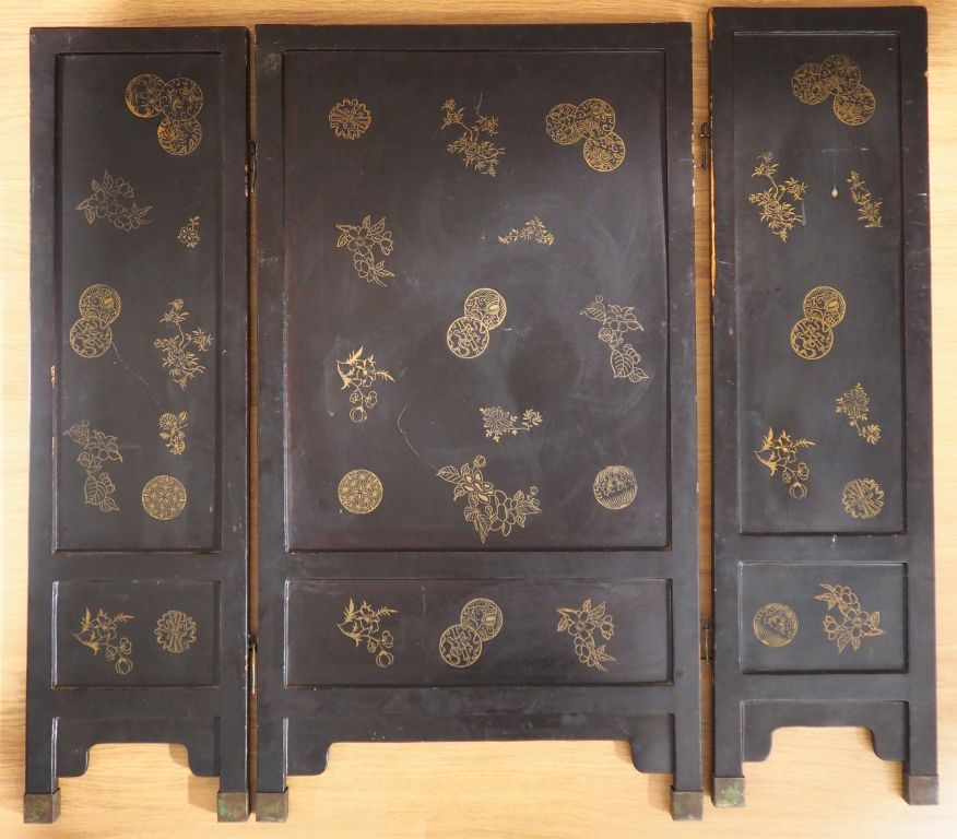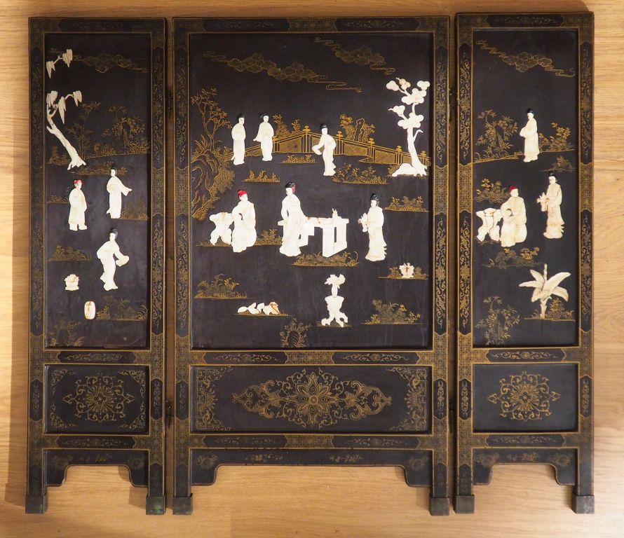 Chine, XXe siècle, Paravent à trois feuilles en laque noire et rehauts d’or à décor de personnages en nacre en léger relief évoluant sur des terrasses arborées. Des rinceaux feuillagés complètent l’ornementation. Dim. 91 x 103 cm