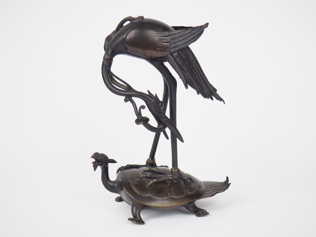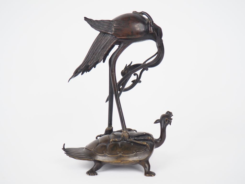 Chine, XXe siècle, Sujet en bronze représentant une grue tenant une branche de fleurs de lotus dans le bec sur une tortue minoga. H. 20 cm
