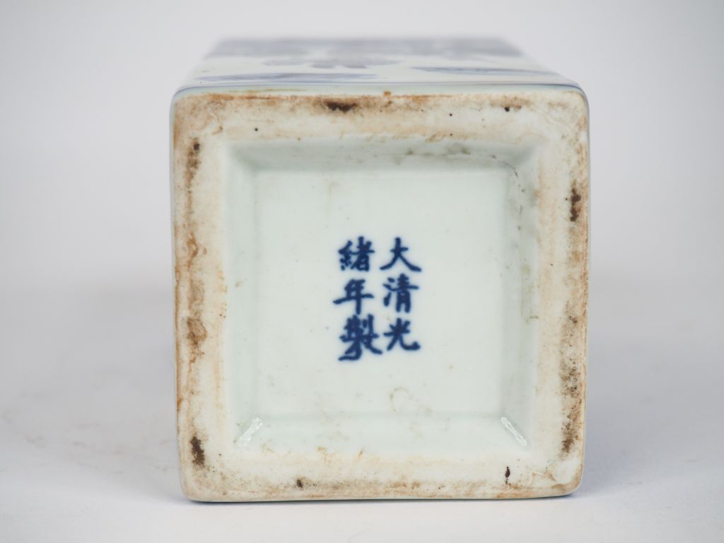 Chine, XXe siècle, Vase en porcelaine bleu blanc à décor au pochoir d’une scène de village H. 12,5 cm