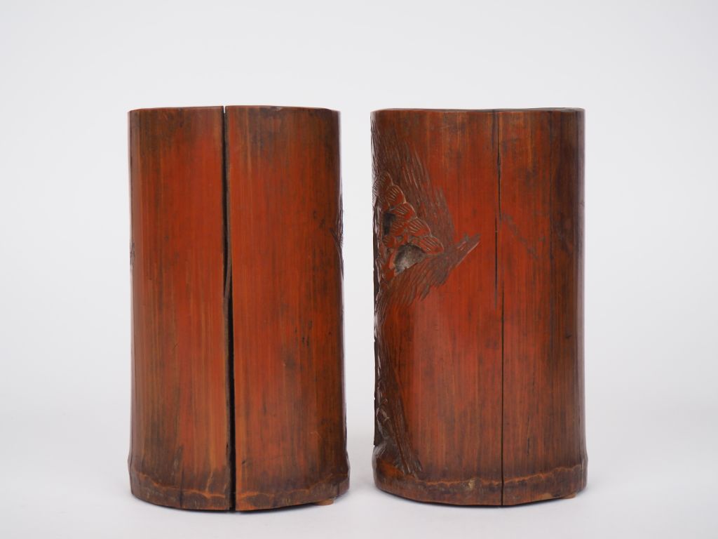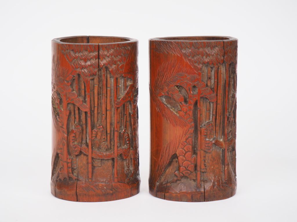 Chine XXème. Paire de porte pinceaux bidong représentant les sages déroulant une peinture dans une fôret de bambous et de pins (gerses) H. 16,5 cm