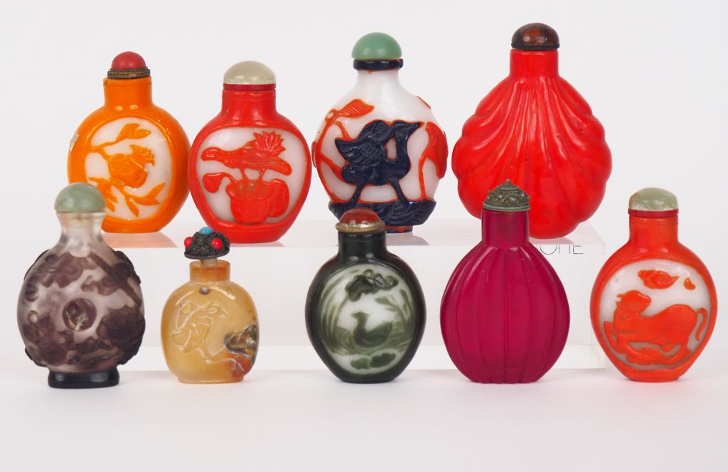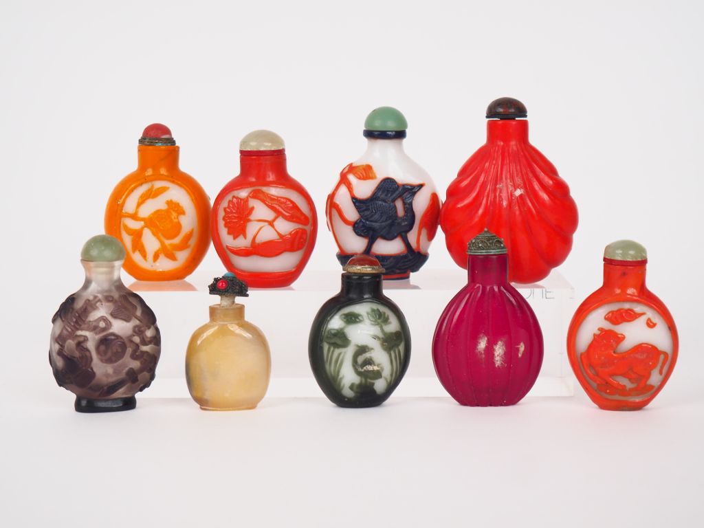 Chine XXème siècle Lot comprenant neuf flacons tabatières, dont sept en verre overlay rouge corail, brun vert à décor divers d’animaux et fleurs, l’un en verre de couleur rubis, l’un en agate sculpté d’un oiseau H. 4,5 à 7,5 cm
