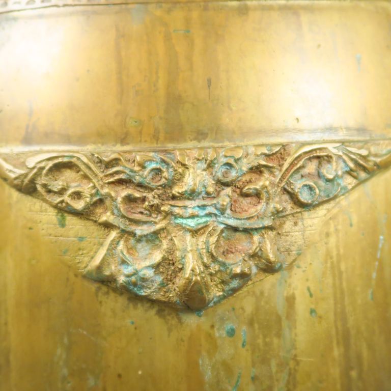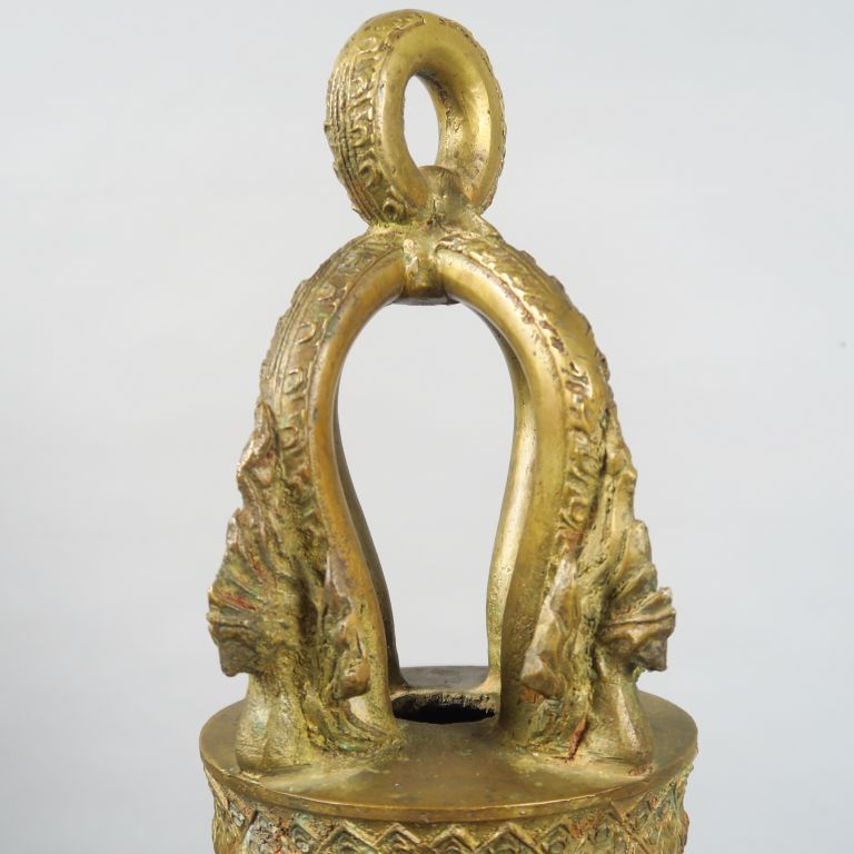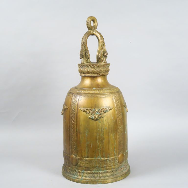 Cloche de temple en bronze dont l'anse est ornée d'oiseaux stylisés Le pourtour à décor de masques d'animaux fantastiques. Birmanie, XIXème siècle. H. 71 cm