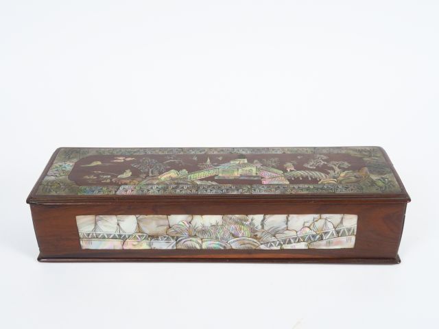 Coffret à gants en bois de rose et incrustations de nacre. Indochine, vers 1900. 41 x 12 cm