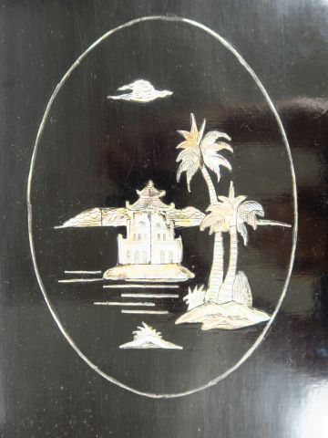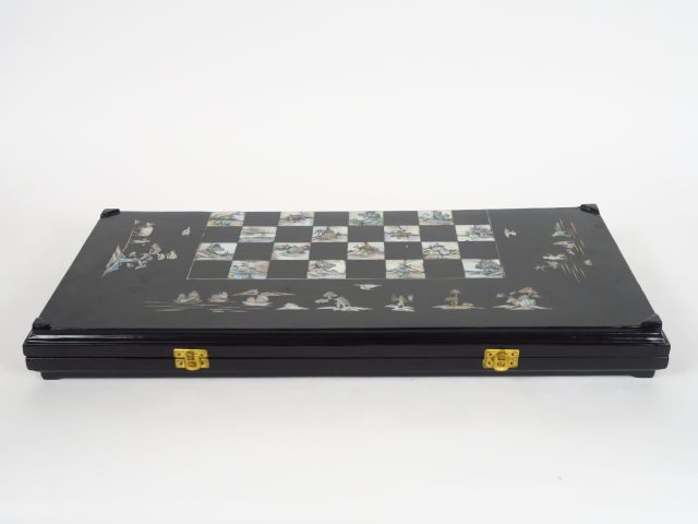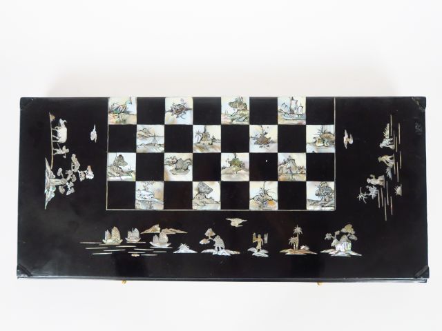 Coffret à jeux en bois laqué et nacre contenant damier, jeu d'échec et jeu de jacquet (incomplet). 63 x 29 cm