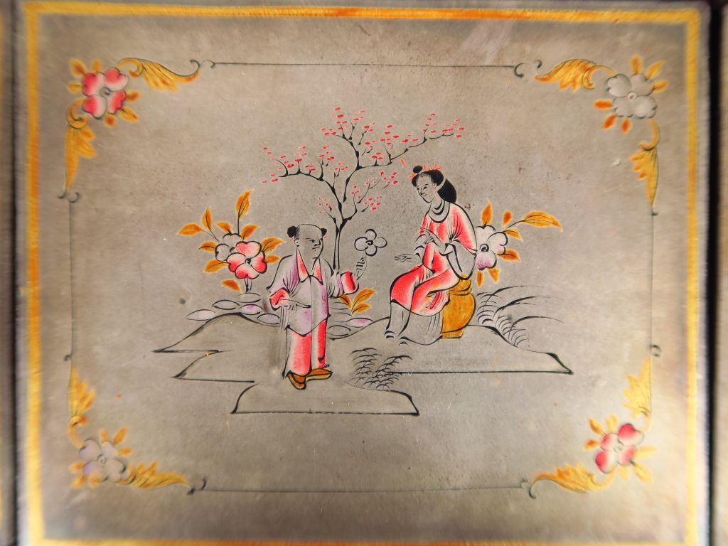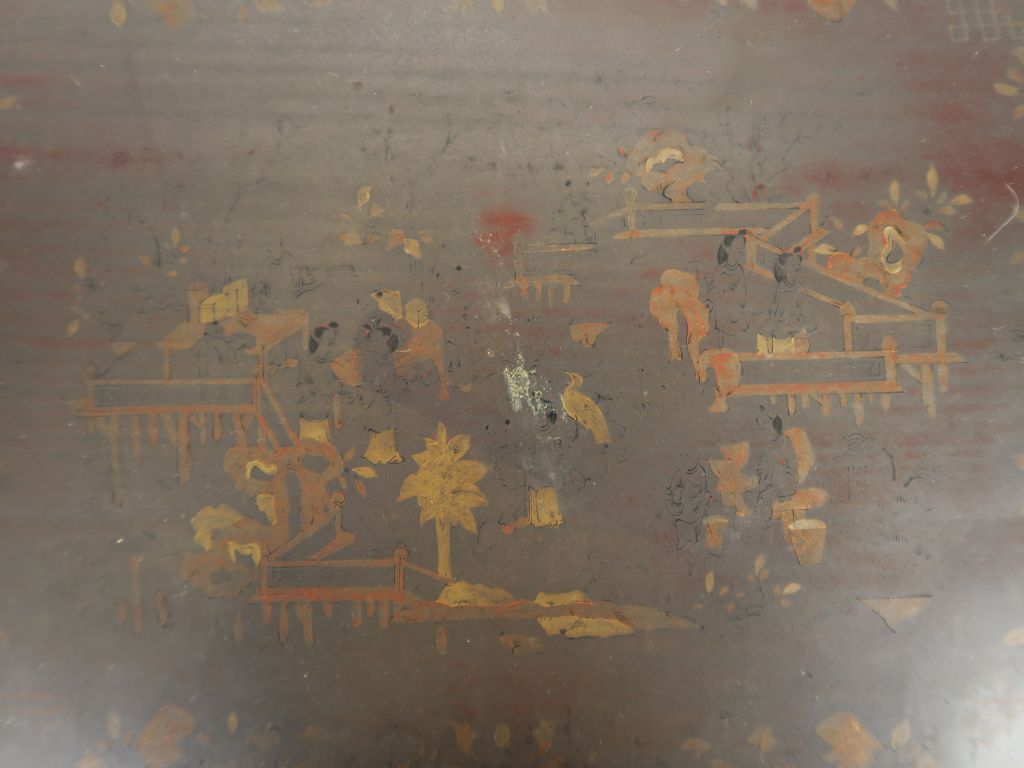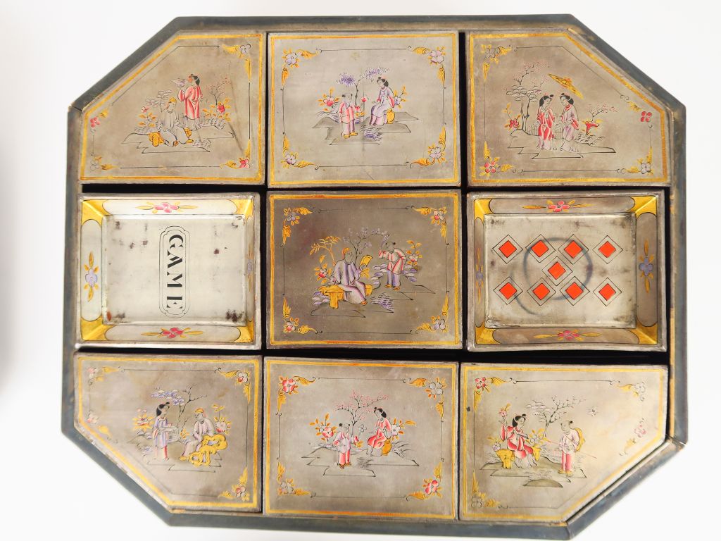 Coffret à jeux en laque de Canton couleur brun argenté, à décor de scènes paysagées et jetons en nacre. Chine, XIXème siècle. Dim. 14 x 38 x 30 cm
