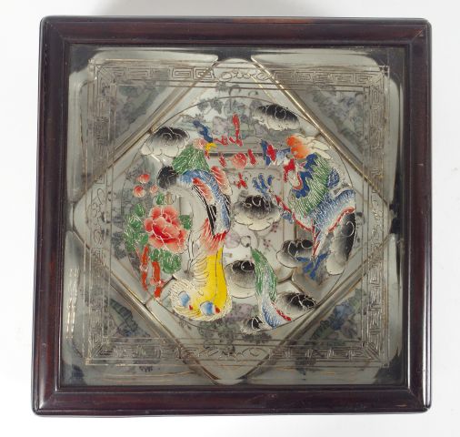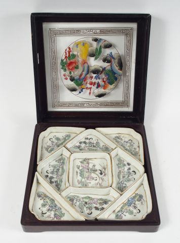 Coffret en bois et verre émaillé contenant neuf raviers à friandises en porcelaine et émaux de la famille rose, à décor de jeunes femmes et d'enfants. Chine, période Guangxu. 27 x 27 cm