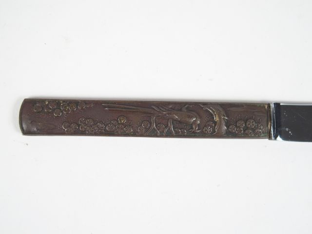 Coffret en forme d'eventail contenant 12 couteaux formés par des manches de Kozuka, décor de personnages légendaires, oiseaux, fleurs et végétaux. Japon, 1900.