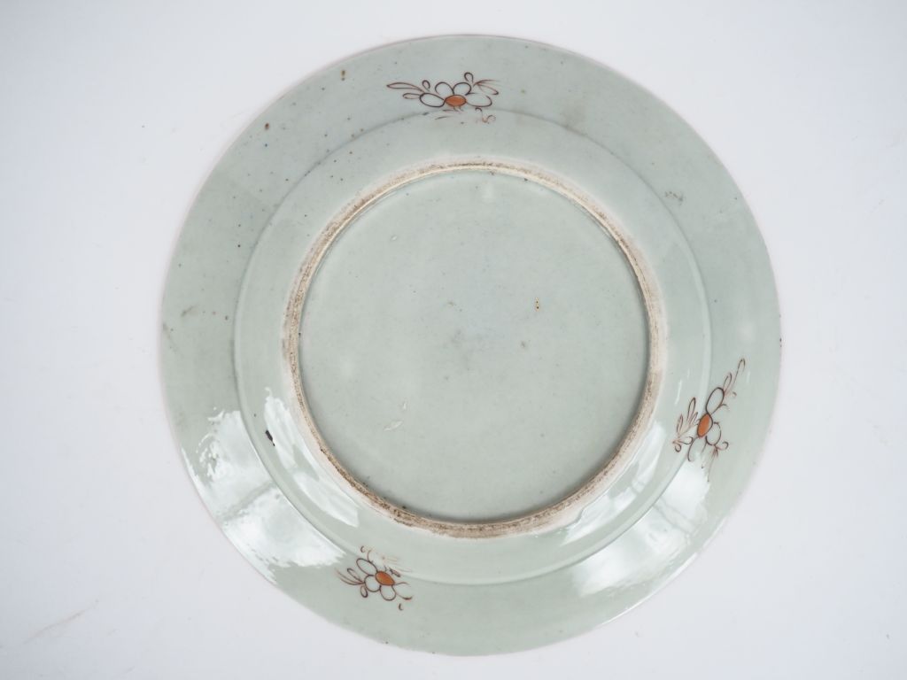 Compagnie des Indes, XVIIIe siècle, Assiette en porcelaine et émaux de la famille rose à décor central d’une composition florale et frise de fleurs sur le pourtour apposée en guirlande. Diam. 23,5 cm