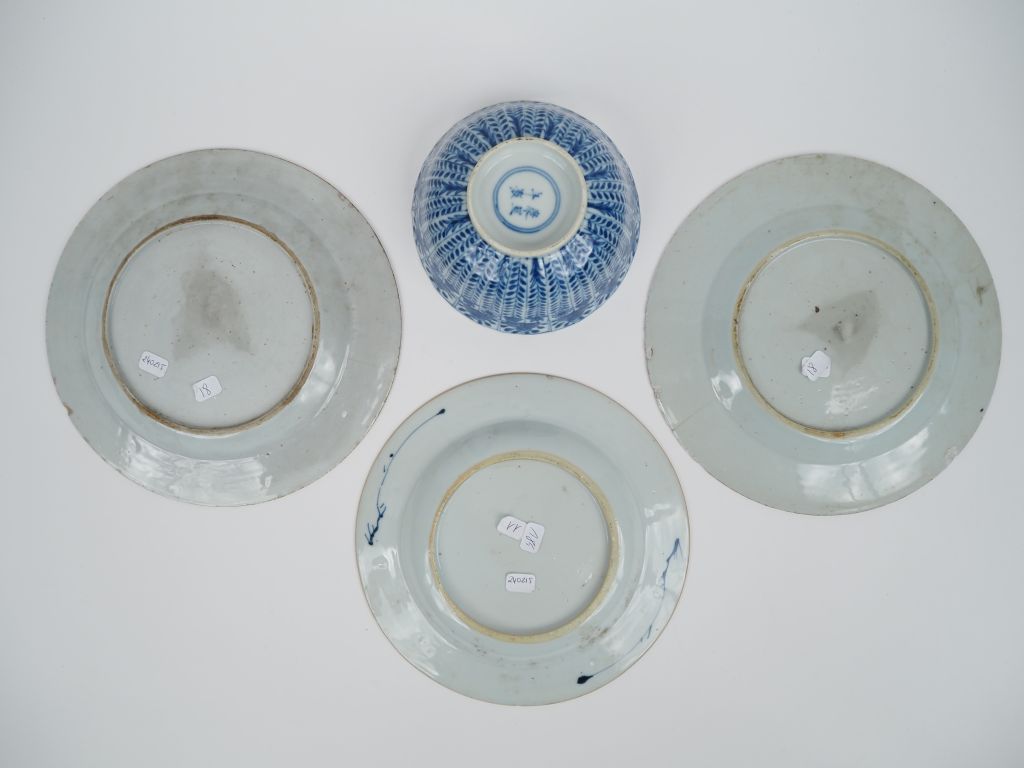 Compagnie des Indes XVIIIe, Trois assiettes en porcelaine bleu blanc à décor de pagodon et scène paysagée, terrasse arborée et composiitons florales. On y joint un bol bleu blanc à décor de rinceaux feuillagés. Egrenures. Diam. 22 et 23 cm Diam. 15 cm
