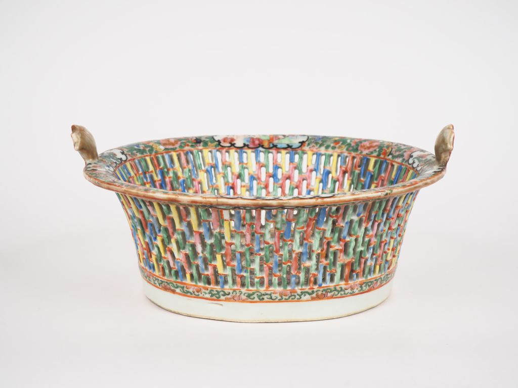 Corbeille ajourée en porcelaine et émaux polychromes de Canton style famille rose à décor ajouré de personnages et de fleurs. Dim. 13,5 x 29 cm. (Fel sur la base)