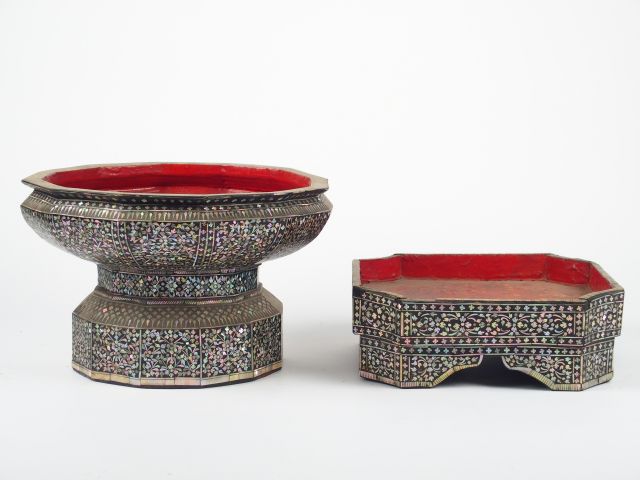 Coupe à offrandes sur piédouche et deux présentoirs de forme hexagonale en bois laqué à décor de burgots, de fleurs de lotus et de végétaux. Début du XIXème (manques). Siam période Rattanakosin