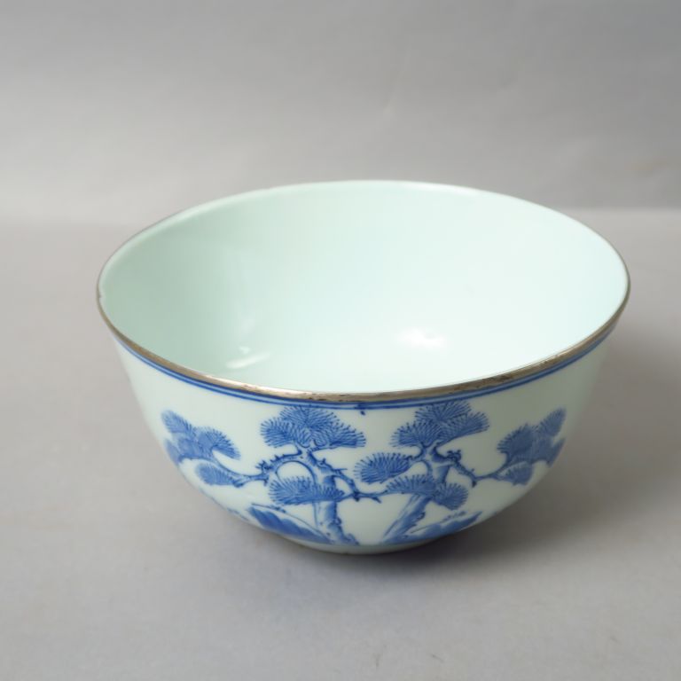 Coupe en bleu de Hué, à décor de pêcheur au bord d’un lac. Marque Neifu sur la base. Vietnam, vers1900. Diam. 17 cm (Petit éclat)