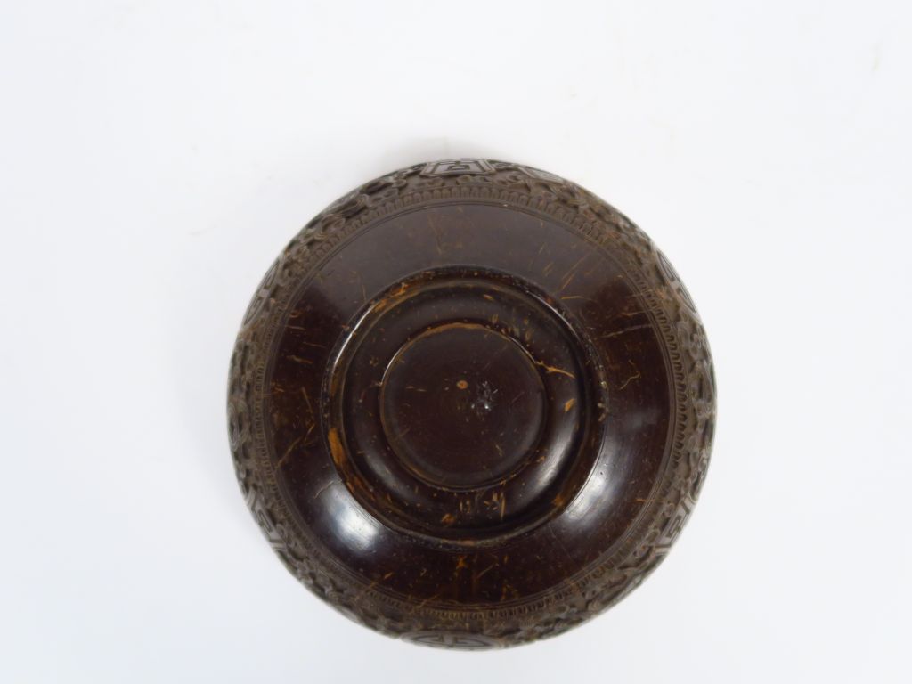Coupe en noix de coco sculptée à décor d'objets précieux et de caractères Fu et Shou, intérieur en argent. Chine XVIIIème/XIXème. Diam. 13,8 cm