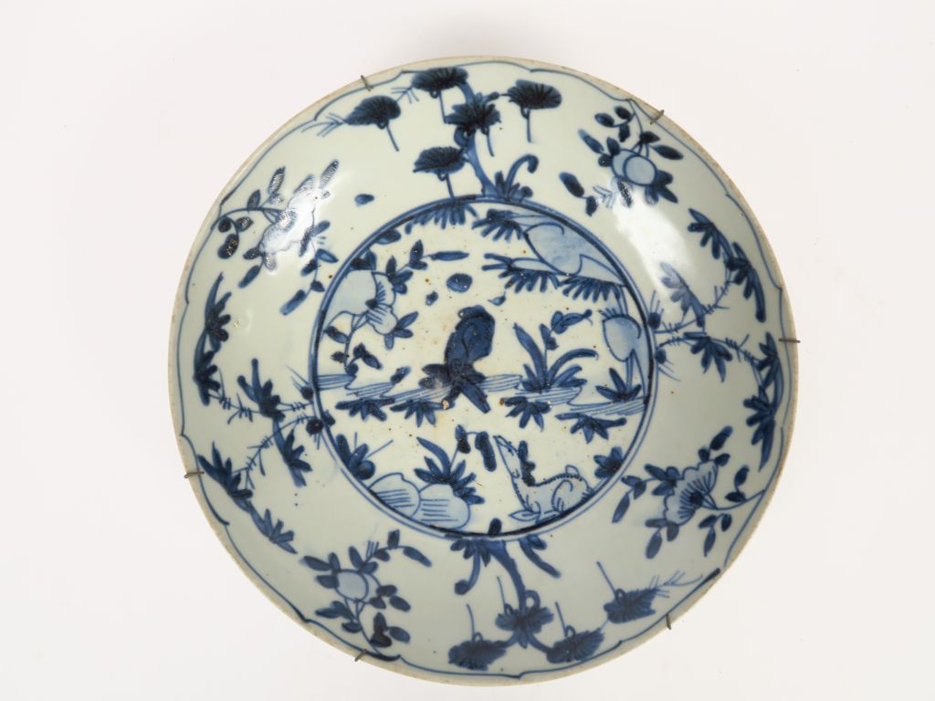 Coupe en porcelaine bleu blanc à décor de deux daims parmi des arbustes en fleurs. Chine Swatow XVIIème. Diam. 27 cm