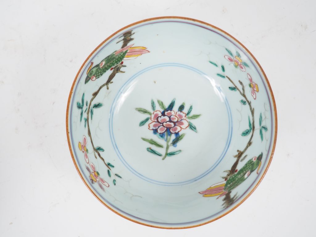 Coupe en porcelaine bleu blanc surdécorée en famille rose d'oiseaux et de fleurs. Chine, XVIIIème siècle. Marque double carpe. Diam. 14,5 cm