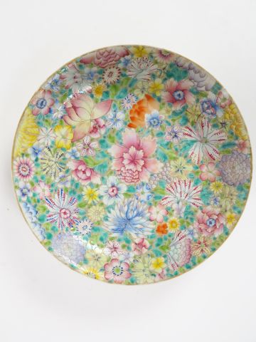 Coupe en porcelaine et émaux de la famille rose, décor mille fleurs. Marque apocryphe Quianlong (petits éclats). Diam. 24,5 cm