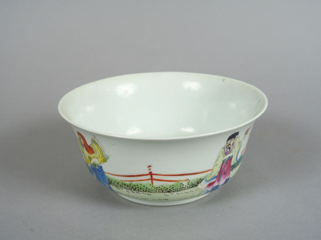 Coupe en porcelaine et émaux de la famille rose, représentant des immortels cueillant des fleurs sur une terrasse. Marque apocryphe Qianlong. Chine, XXème siècle. Diam. 16,8 cm