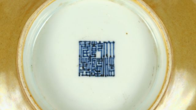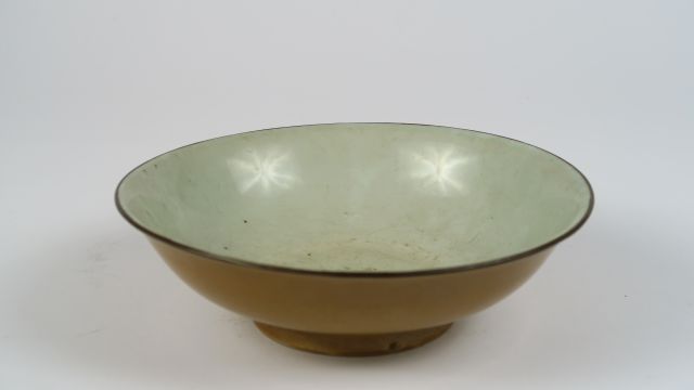 Coupe évasée en porcelaine à couverte café au lait extérieure, cerclée de métal, porte une marque Qing. Chine, période Qianlong, XVIII ème siècle. Diam. : 15,5 cm