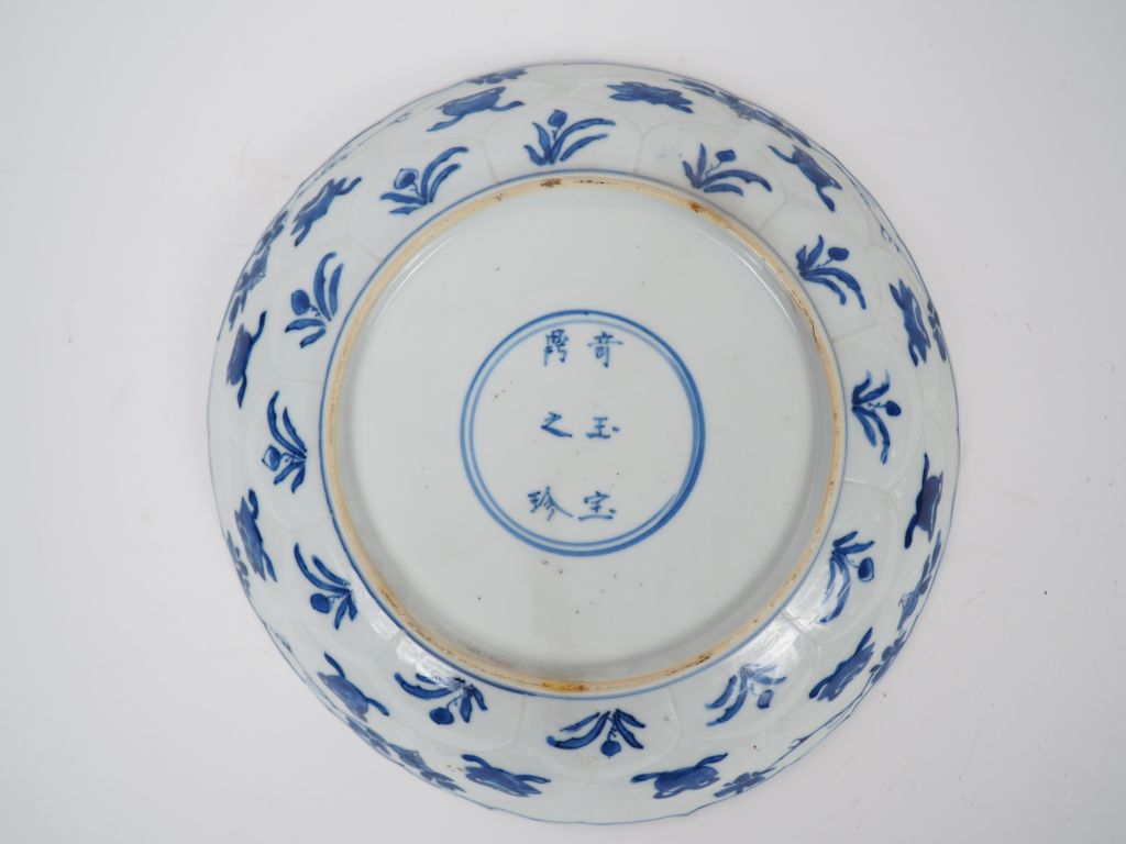 Coupe floriforme en porcelaine blanche décor en bleu sous couverte de composition florale et d'objets précieux. Chine, début du XVIIIème siècle, période Kangxi. Marque au revers. Diam. 22,5 cm