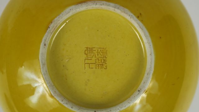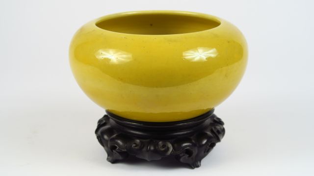Coupe ovoïde en porcelaine émaillée jaune, sur socle bois, marque Yongzheng apocryphe. Chine, dynastie Qing, XIX ème siècle. Diam. 16 cm