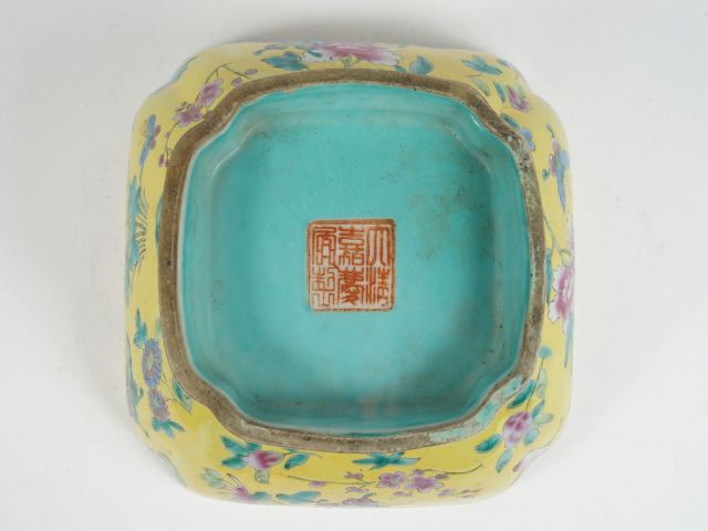 Coupe quadrilobée en porcelaine et émaux de la famille rose, décor de papillons, fleurs de pivoine, de lotus et de prunus sur fond jaune. Chine, Dim. : 18 x 18 x 9,2 cm