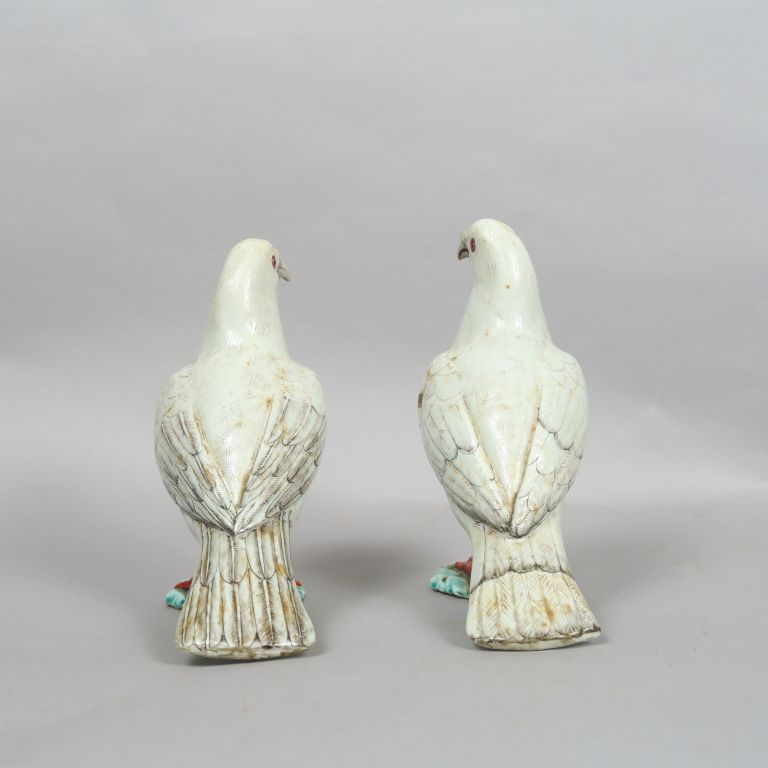 Couple de colombes en céramique émaillée blanc et corail. Chine, XIXème siècle. H. 18 cm et 17 cm