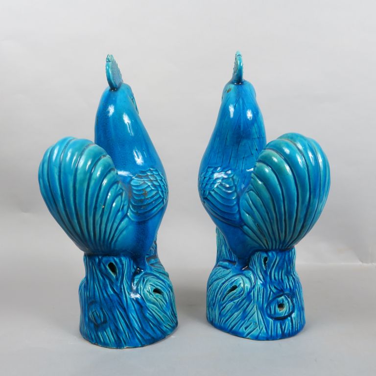 Couple de coqs en céramique émaillé turquoise. Chine, fin XIXème siècle. H. 35 cm et 34,5 cm