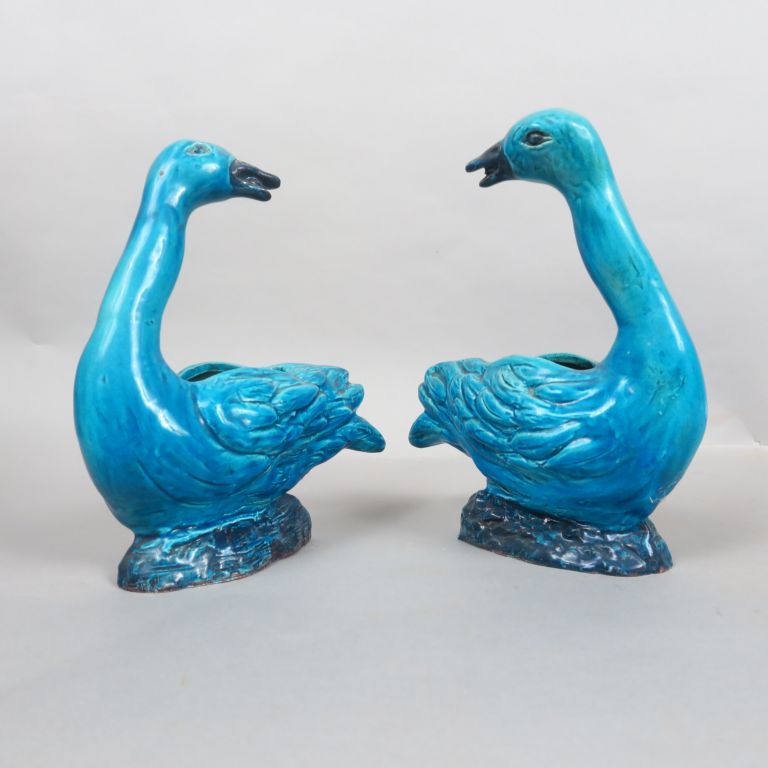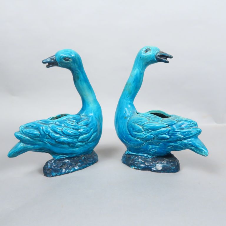Couple de cygnes formant jardinières en céramique émaillé turquoise. Chine, vers 1900. H. 23 cm et 22,5 cm
