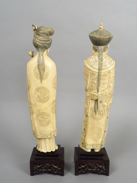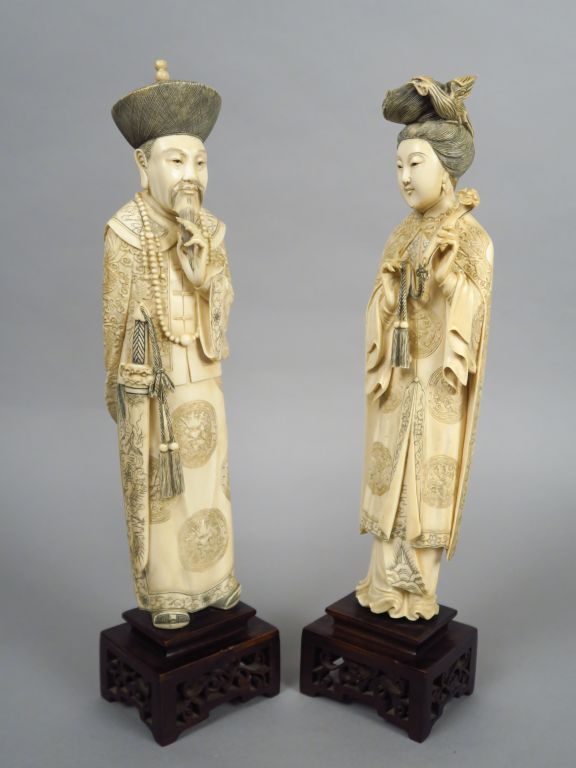 Couple de dignitaires en ivoire dont la robe est finement sculptée (petits accidents). Chine, vers 1930. H. 31 et 31,5 cm Poids tel.2124 gr Nom scientifique de l’ivoire : ivoire d’éléphant Elephantidae spp (I/A, pré-convention), spécimen antérieur au 1er juin 1947 et conforme à la réglementation CE 338/97 du 09/12/1996, art. 2-W mc. Pour une sortie de L’UE, un CITES de ré-export sera nécessaire, celui-ci étant à la charge de l’acquéreur.